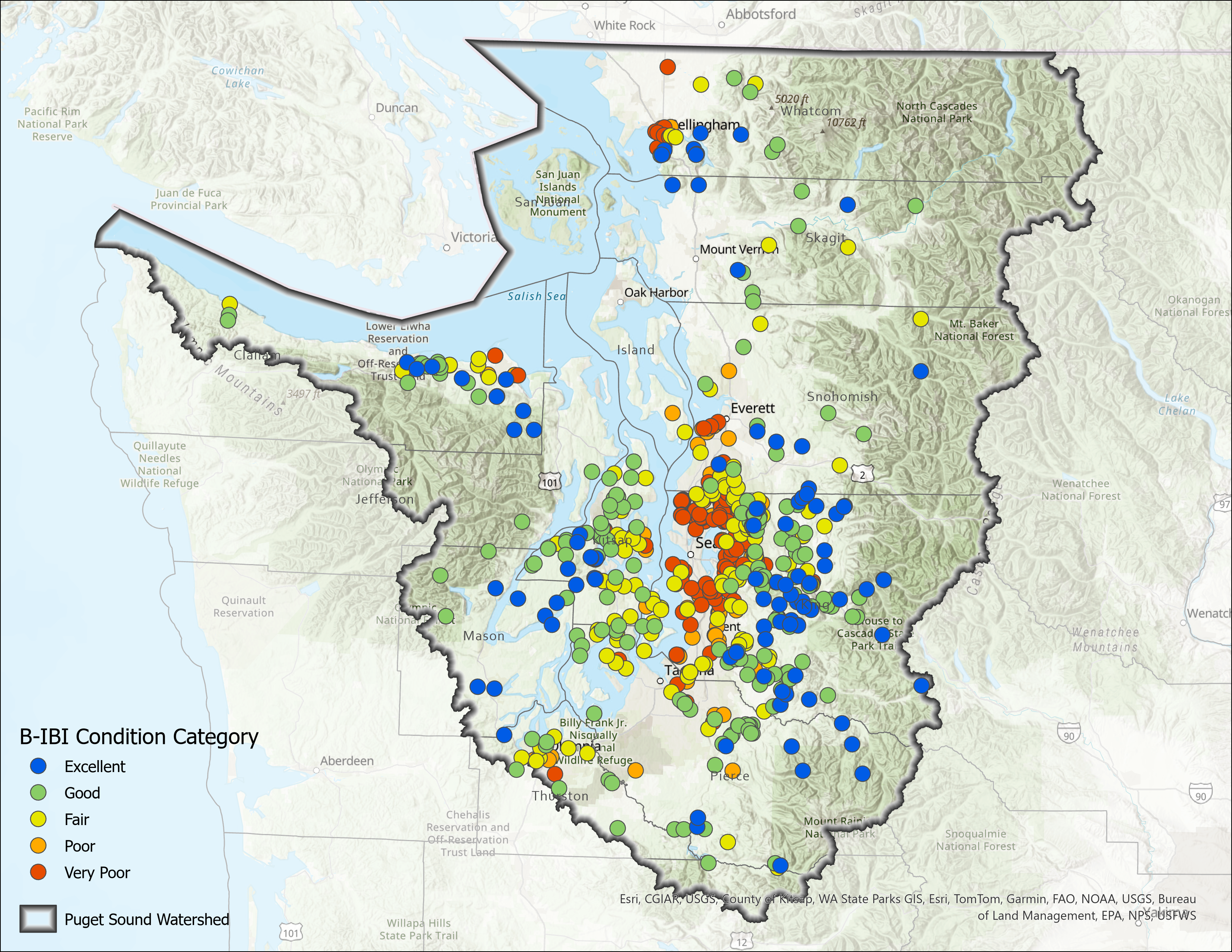 The Benthic Index of Biotic Integrity (B-IBI) describes the biological condition of stream sites and their surrounding habitat based on the diversity and relative abundance of the benthic (bottom dwelling) macroinvertebrates found at the site. Ten measures of biological condition are scored and summarized as the B-IBI, which ranges from a score of 0, indicating very poor stream condition, to 100, indicating excellent condition.