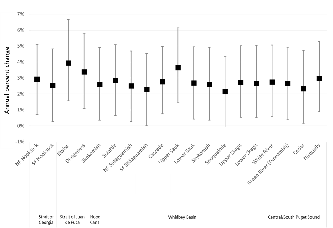 There have been small signs of recovery of Puget Sound Chinook populations in each biogeographic region since they were listed as threatened under the Endangered Species Act in 1999. Almost all populations are increasing in natural-origin, naturally-spawning abundance in recent years (i.e., the credibility interval for only one population overlaps with zero in the percent change figure). However, the trends vary across populations with some exhibiting only very small change. Thus, combined with uncertainty about the underlying data and model, our conclusion about progress of the populations of Puget Sound Chinook salmon is “Mixed Results.”