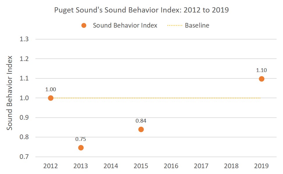 Sound Behavior Index for Puget Sound residents randomly surveyed using mailers in 2012 (baseline), 2013, 2015, and 2019 via the Sound Behavior Survey, commissioned by the Puget Sound Partnership. Sample size for each survey was as follows: 3,621 respondents in 2012, 3,131 respondents in 2013, 3,000 respondents in 2015, and 1,732 respondents in 2019.
