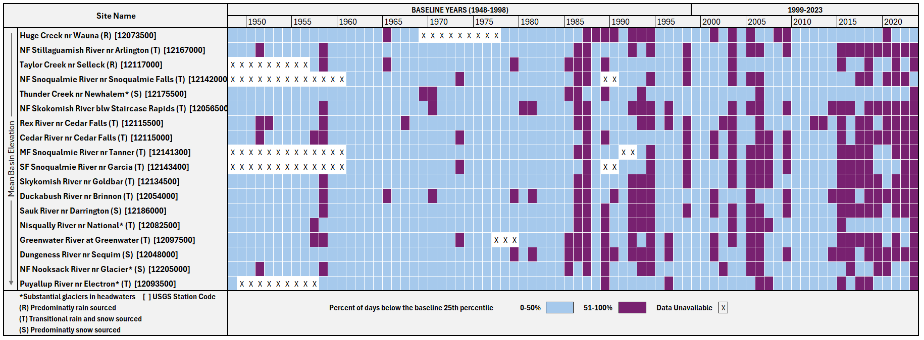 Status of annual summer low flow at indicator streamgages. Each cell is color coded for a category of frequency of below normal flow. Categories are based on the percentage of days each year between July 15th and October 31st where the 7-day mean daily flow was below normal (i.e., below the 1948-1998 baseline 25th percentile). When most days (50% or more) were below normal, the cell is shaded purple. When fewer than 50% of the days were below normal, the cell is shaded blue. Streamgages are highlighted as 1) (R) rain sourced, 2) (T) transitional (between rain and snow sourced), or 3) (S) snow sourced. Streams with substantial glaciers in their headwaters are denoted with an asterisk. Streams are arranged in order from streams with lowest mean basin elevation to highest.