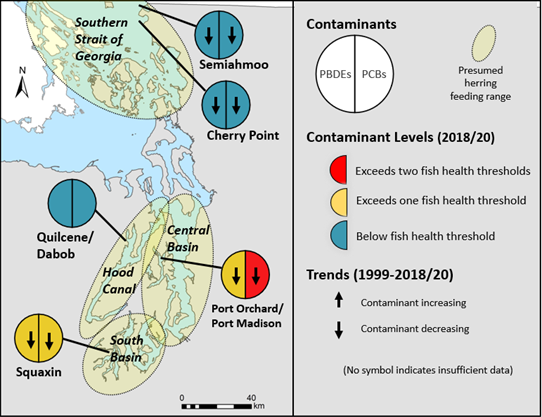 Washington State Department of Fish and Wildlife, Toxics Biological Observation System (unpublished data); Winnacott, N. H. F., L. B. Harding, K. Hayes, and S. M. O’Neill. 2025. Contaminants in Pacific Herring, 2020 Status and Trends Report, Washington Department of Fish and Wildlife, Olympia, Washington.
