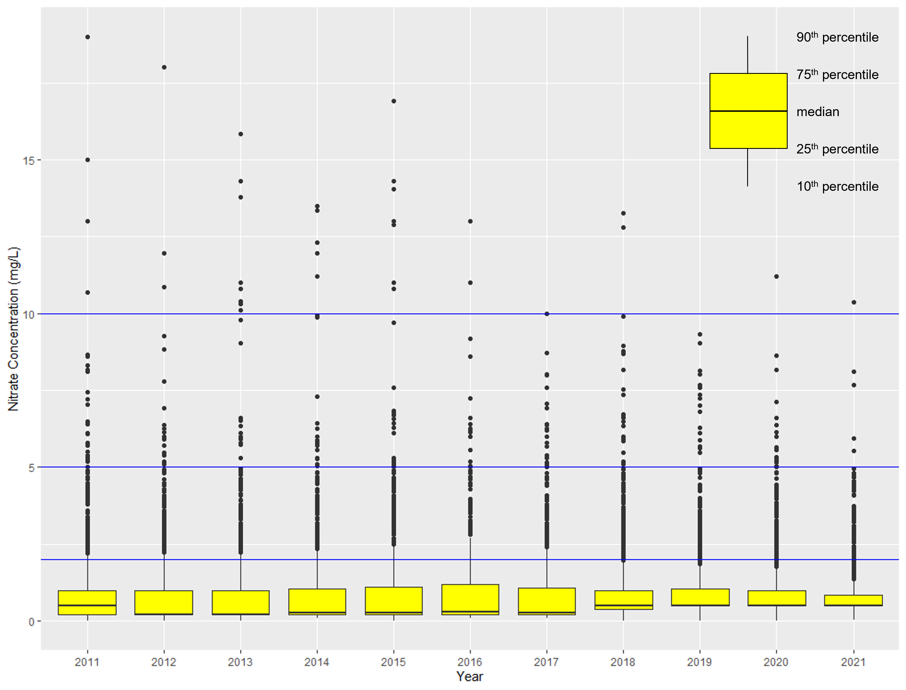 Annual nitrate concentration (mg/L) in groundwater sources for Group A systems across Puget Sound (2011-2021). The yellow boxes illustrate the middle 50% of the concentration values, showing the first quartile (25th percentile), median (center), and third quartile (75th percentile). Whiskers are drawn to the 10th and 90th percentile; points outside the whisker boundaries represent outlier values. Blue reference lines are drawn at 2, 5 and 10 mg/L to show regulatory and health thresholds. Nitrate concentrations below 2 mg/L reflect levels found in natural groundwater. Concentrations above 2 mg/L indicate human activities contribute to contamination. When concentrations exceed 5 mg/L the frequency of sampling increases to better monitor concentrations. 10 mg/L is the EPA's maximum contaminant level for nitrate.
