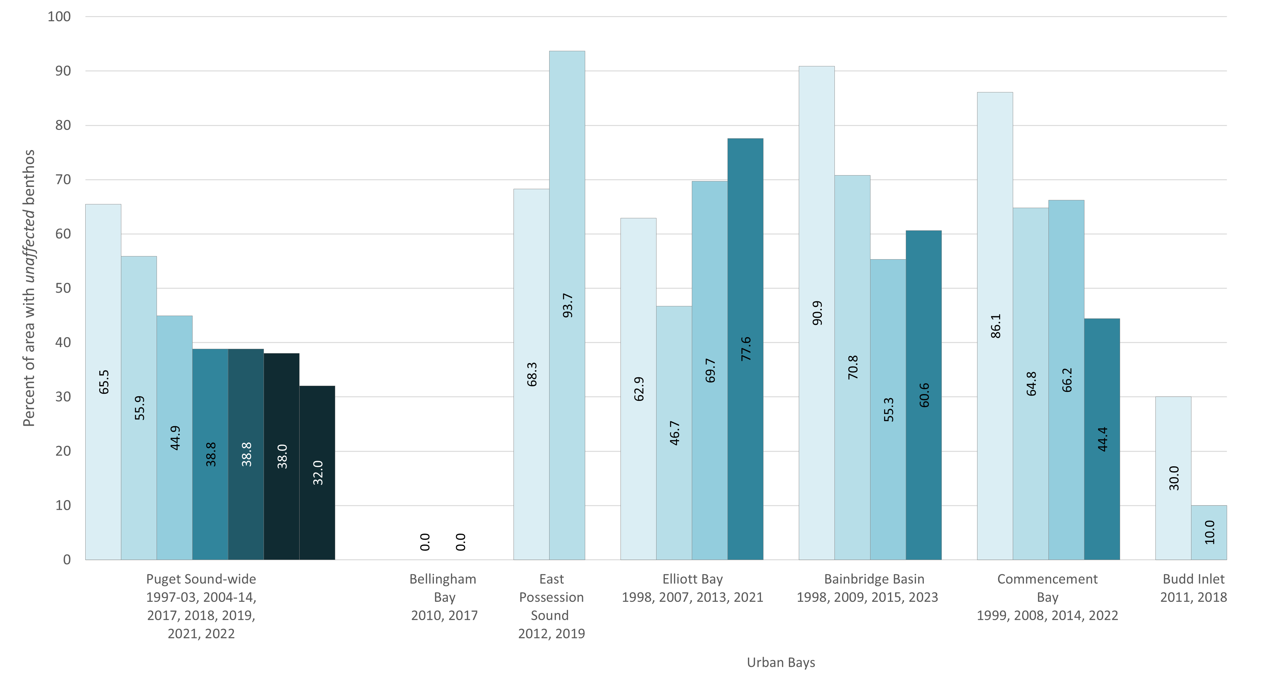 Percent of study area with unaffected benthic invertebrate communities, as determined by our Sediment Benthic Index for each sampling event, spring monitoring Puget Sound-wide program, June Urban Bays monitoring program.