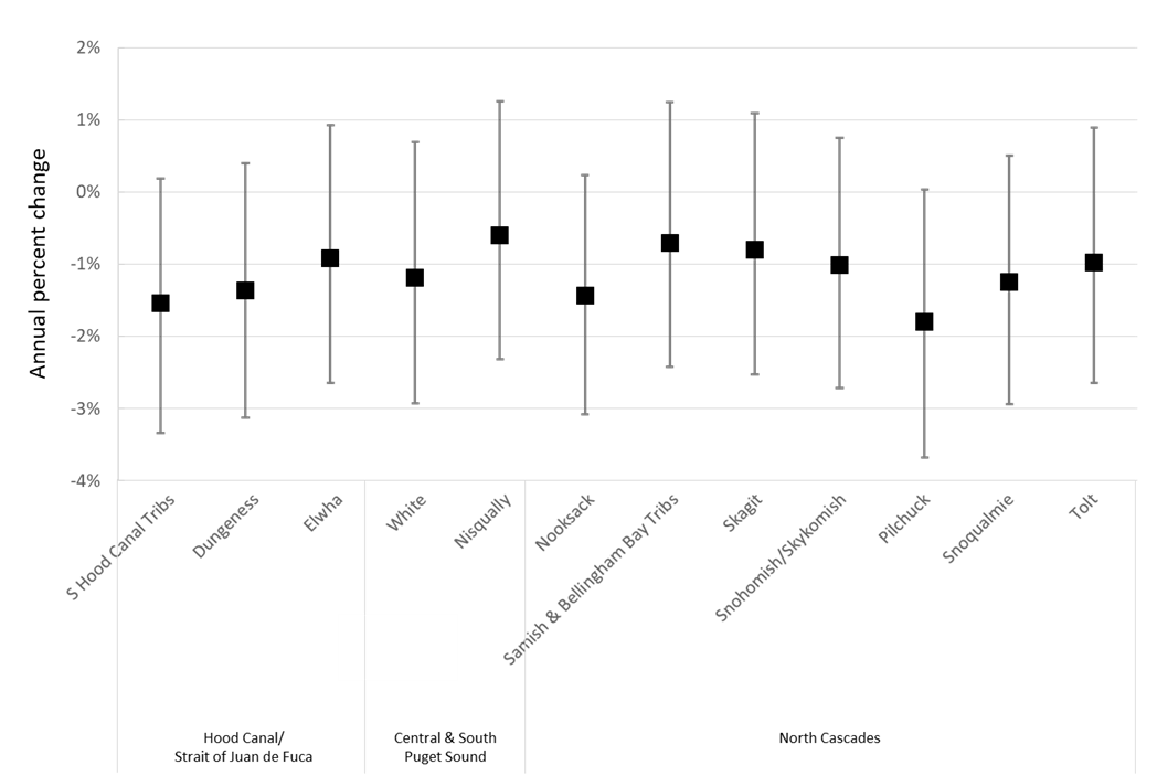 Annual percent change in steelhead spawner abundance from 2007 (year of Endangered Species Act listing) to 2023 for 12 Puget Sound populations, shown by geographic region. Abundance data were not available at the necessary spatial scale for other Puget Sound steelhead populations. The lines show the 25th to 75th credibility intervals (CIs). CIs represent a range of values the true annual percent change likely falls within. CIs for all populations contain zero, suggesting no statistically significant change in spawner abundance from 2007 to 2023.