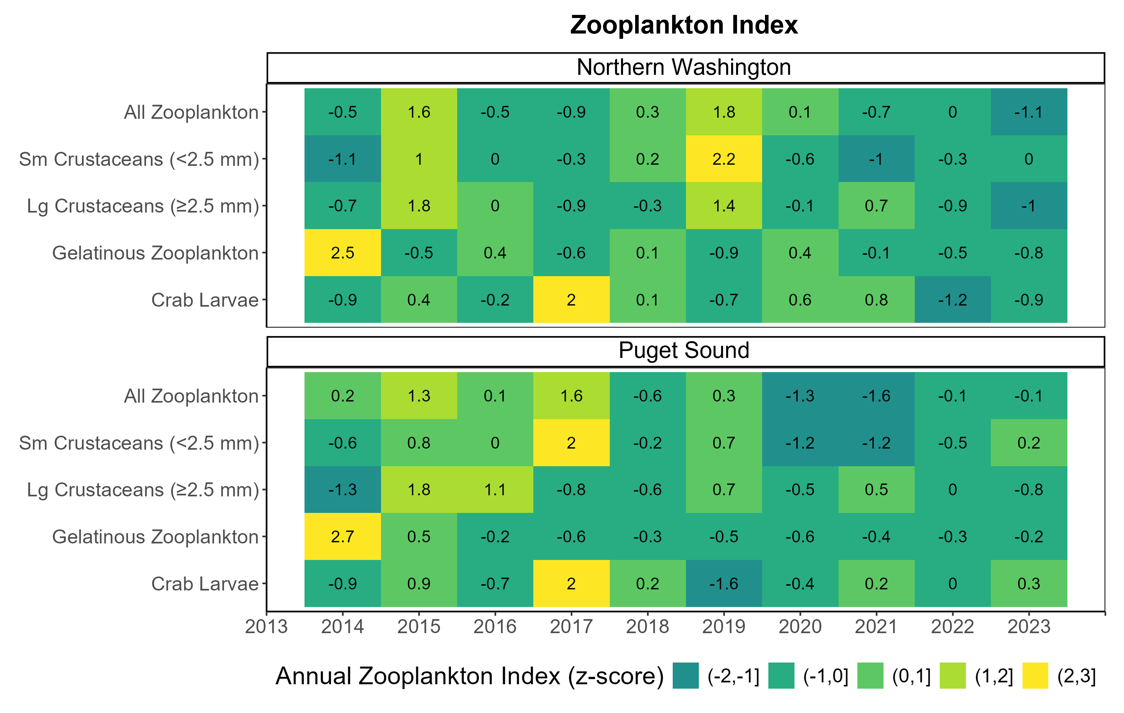 Zooplankton Index reported as z-scores from 2014-2023 for five taxa groups in two regions, Northern Washington (NWA) and Puget Sound (PS). Colors indicate whether the annual average biomass was 1-3 standard deviations (SD) above (positive) or below (negative) the mean. Values are relative to the calculated mean of each region and taxon.