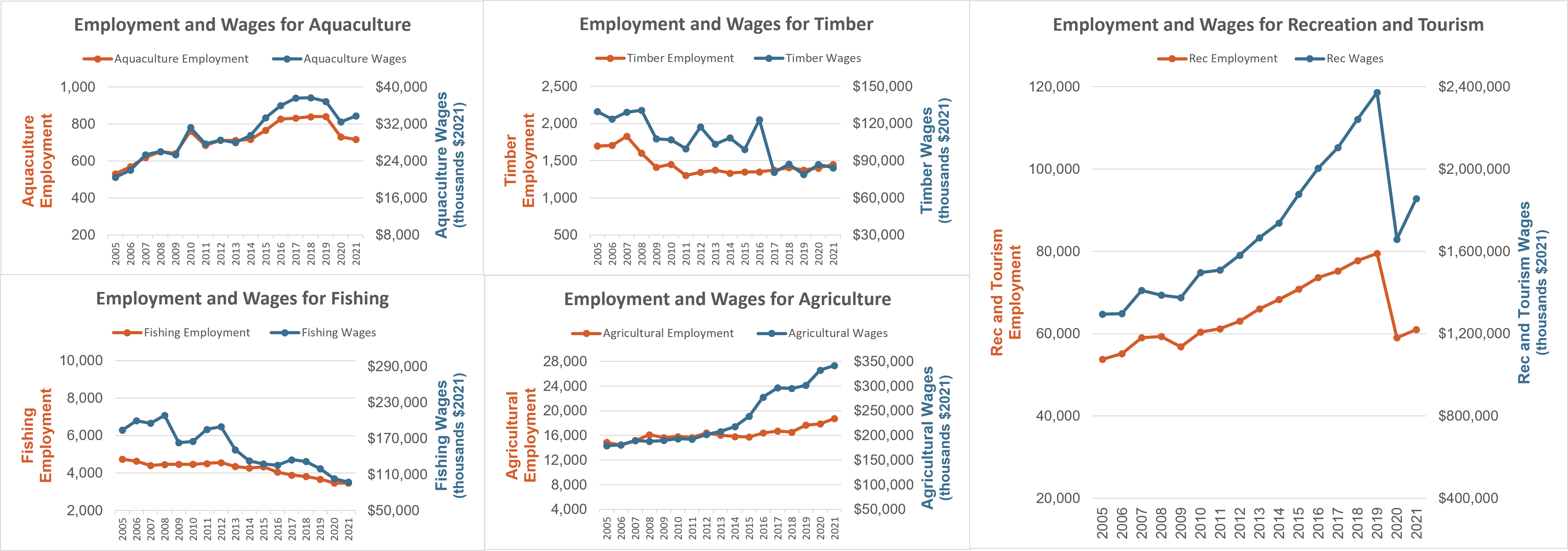 National Oceanic and Atmospheric Administration (NOAA) Economics: National Ocean Watch; Bureau of Labor Statistics (BLS) Quarterly Census of Employment and Wages; Bureau of Economic Analysis (BEA) Regional Data: Local Area Personal Income and Employment; Headwaters Economics: Economic Profile System (HW EPS), Washington State Department of Natural Resources (WADNR), Washington State Department of Agriculture (WSDA)